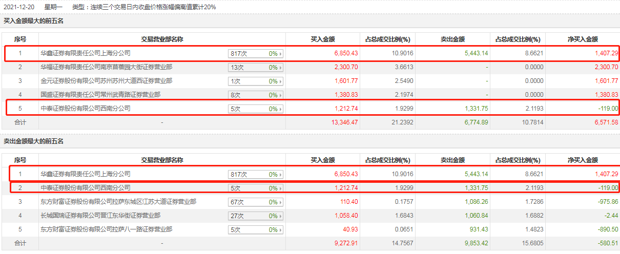 同样的情形在12月16日至20日三个交易日内也出现了。延华智能交易情况显示,该三个交易日内,华鑫证券有限责任公司上海分公司以6850.43万元处于该公司买入榜的第一名,但又以5443.14万元位居卖出榜的第一名;这期间,中泰证券股份有限公司西南分公司也以1212.74万元处于买入榜的第5名,也以1331.75万元居于延华智能卖出榜的第二名。