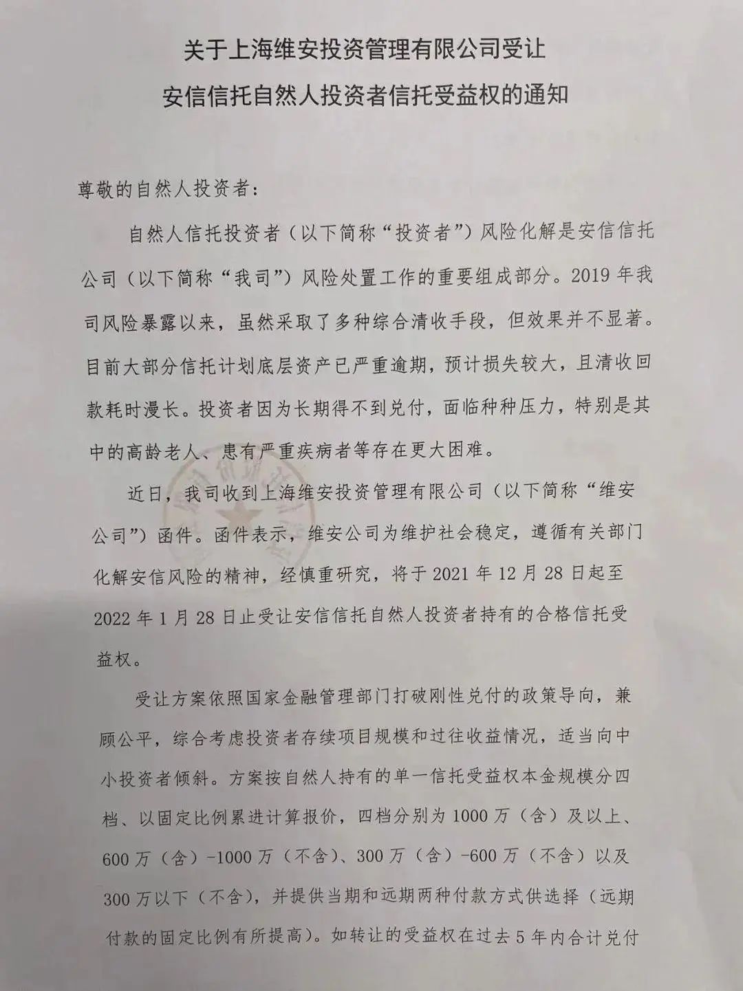 《通知》显示,安信信托近日收到上海维安投资管理有限公司(以下简称“维安公司”)函件。函件表示,维安公司为维护社会稳定,遵循有关部门化解安信信托风险的精神,经慎重研究,将于2021年12月28日起至2022年1月28日止,受让安信信托自然人投资者持有的合格信托受益权。