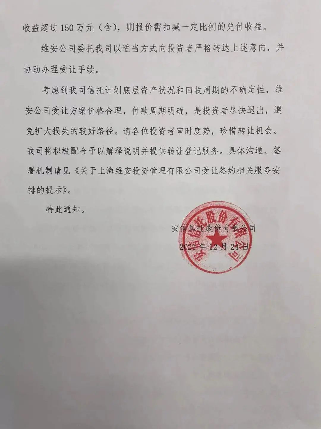 《通知》称,维安公司委托安信信托以适当方式向投资者严格转达上述意向,并协助办理受让手续。