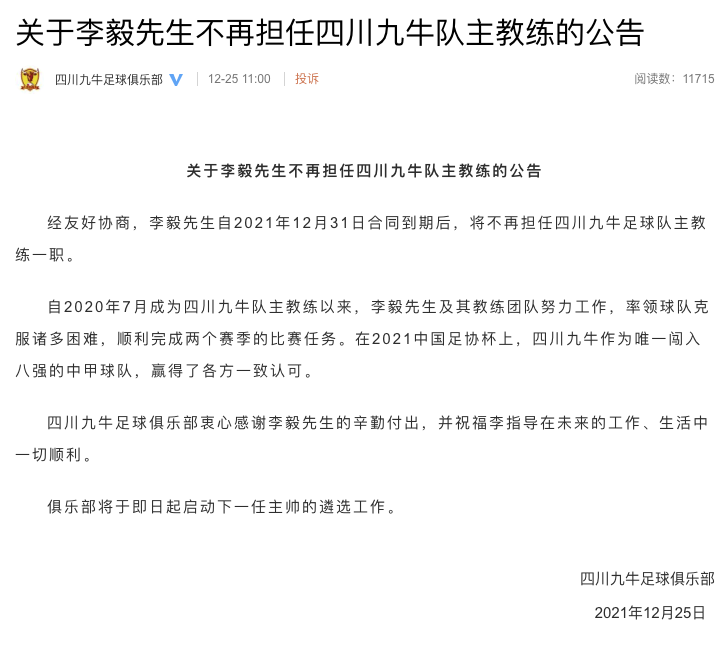 12月25日上午,@四川九牛足球俱乐部 微博发布公告称,经友好协商,李毅自2021年12月31日合同到期后,将不再担任四川九牛足球队主教练一职。俱乐部将于即日起启动下一任主帅的遴选工作。