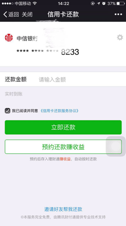 点击 “预约还款赚收益”的选项,用户将进入“信用卡预约还款”页面,通过设置相应的信用卡还款账户、还款金额同时自主设定账单最后还款期,选择“提交”即可预约成功。