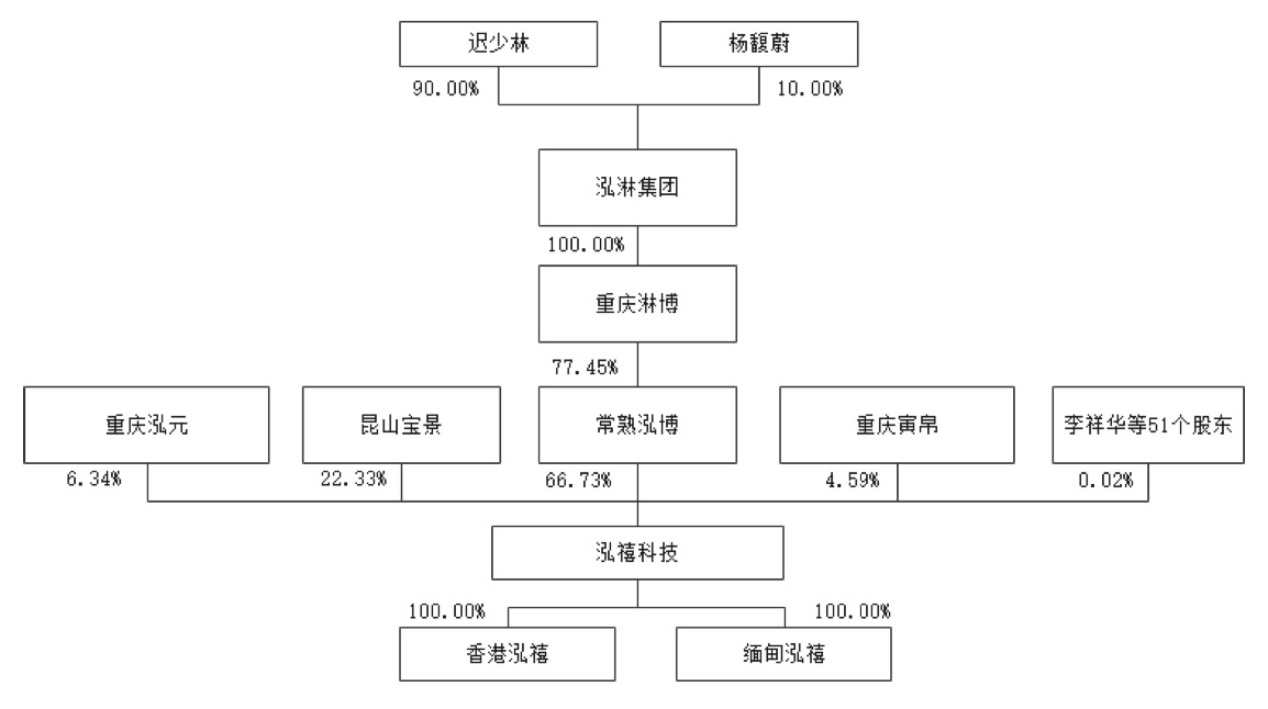 泓禧科技控股股东为常熟泓博,直接持有发行人66.73%的股份。截至招股说明书签署日,重庆淋博持有常熟泓博77.45%的股份,泓淋集团持有重庆淋博100%的股份,迟少林持有泓淋集团90%的股权,迟少林通过泓淋集团、重庆淋博、常熟泓博控制泓禧科技,因此迟少林为公司实际控制人。