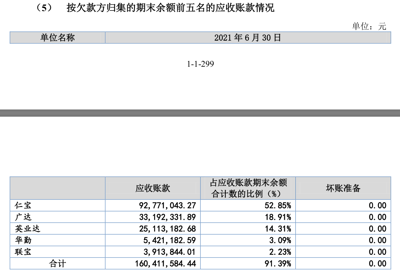 从钱款放归集的期末余额来排序,2021年上半年仁宝的应收帐款9277.1万元,占余额比例高达52.85%,广达的应收帐款为3319.23万元,占比18.91%,英业达占比14.31%。与上述的前五客户信息一致。