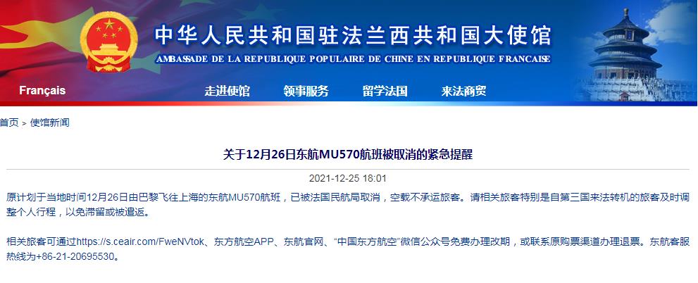 中国驻法国大使馆12月25日发布紧急提醒,原计划于当地时间12月26日由巴黎飞往上海的东航MU570航班,已被法国民航局取消,空载不承运旅客。请相关旅客特别是自第三国来法转机的旅客及时调整个人行程,以免滞留或被遣返。