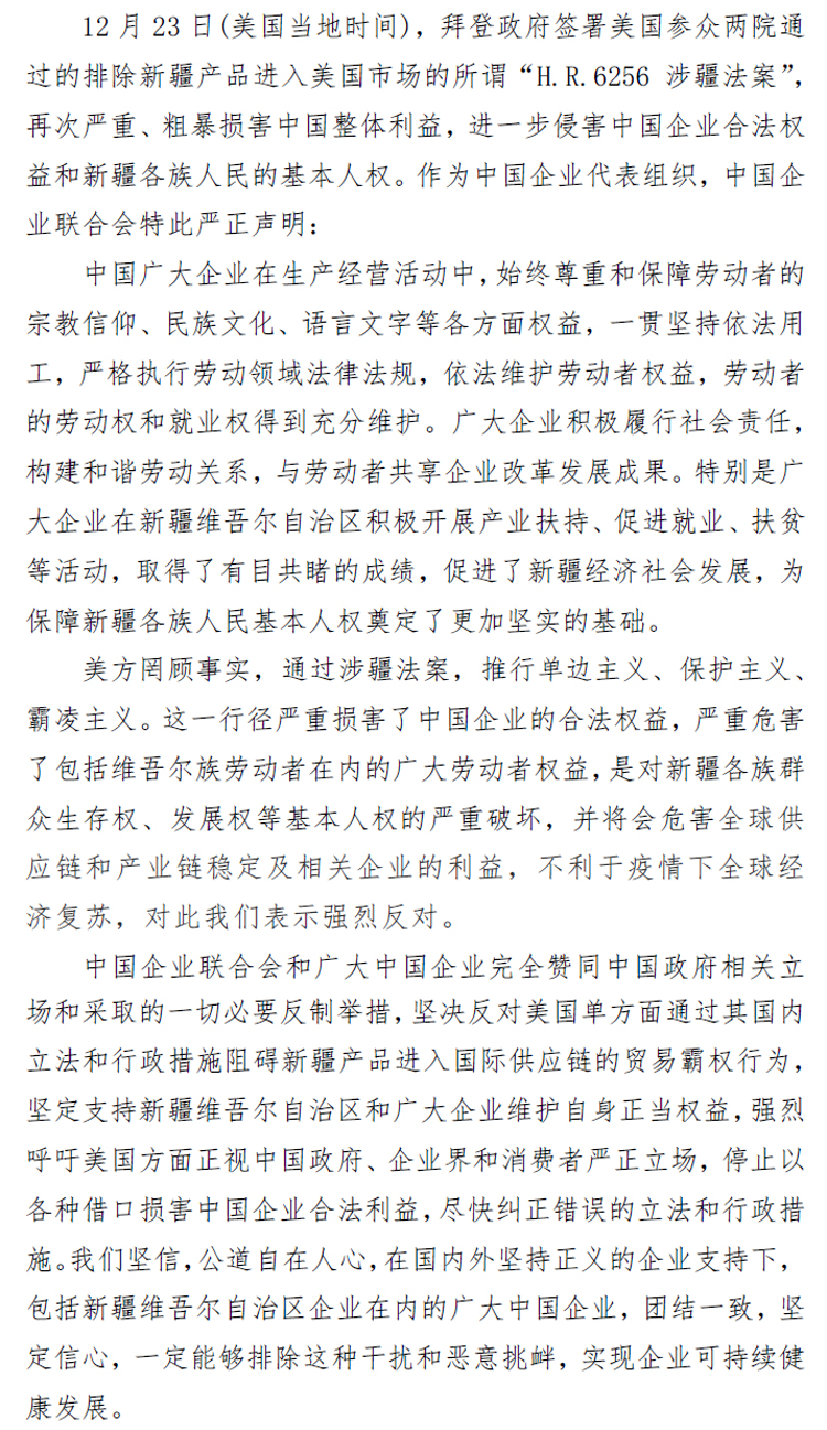 中国企业联合会12月25日发表严正声明,坚决反对美国单方面通过其国内立法和行政措施阻碍新疆产品进入国际供应链的贸易霸权行为,坚定支持新疆维吾尔自治区和广大企业维护自身正当权益,强烈呼吁美国方面正视中国政府、企业界和消费者严正立场,停止以各种借口损害中国企业合法利益,尽快纠正错误的立法和行政措施。