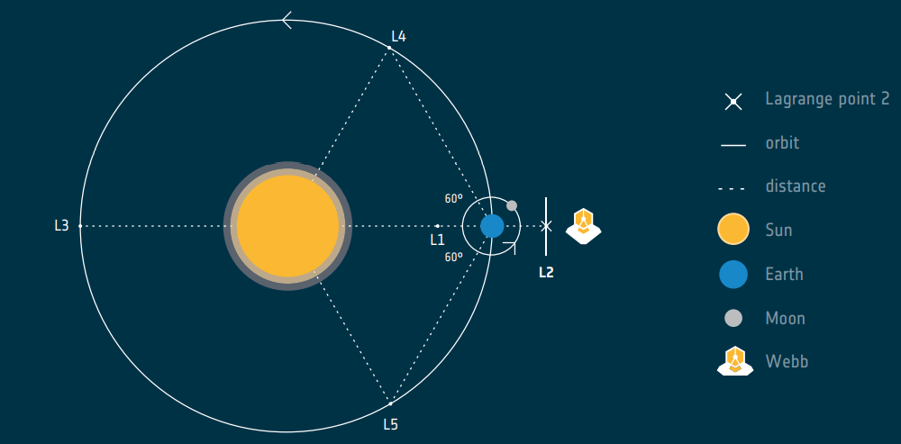 ▲韦布空间望远镜预计会飞到L2点,然后开始绕日运行(来源:欧洲航天局)