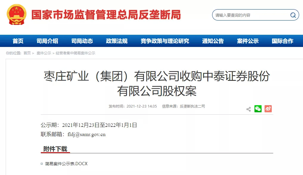 12月23日,国家市场监督管理总局反垄断局网站公示枣庄矿业(集团)有限公司收购中泰证券股份有限公司股权案,公示期为2021年12月23日至2022年1月1日。