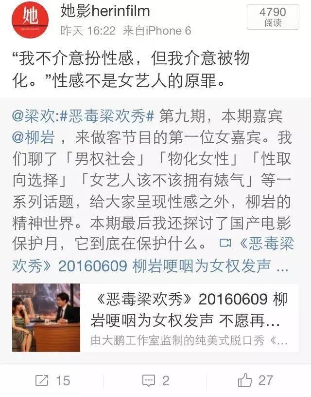 柳岩在最新一期的《恶毒梁欢秀》里,当面对梁欢关于在圈内还是一个特别男权的环境里柳岩是否想过做一个“婊”的女明星时,她说也许在欧美这样的女星会很受人欢迎,但是扪心自问,在我们现在这个时代,她做不到。