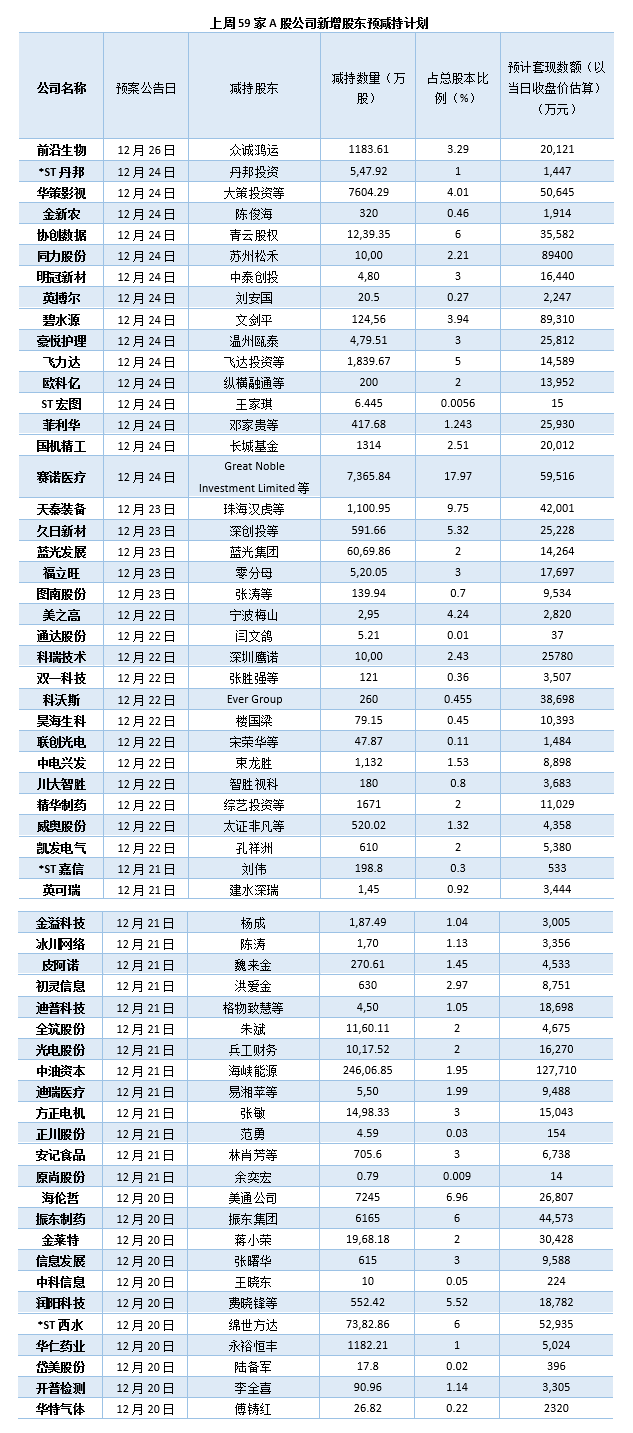 上周(12月20日至12月26日),A股市场减持规模环比有所减少。据界面新闻不完全统计,共有59家A股公司披露股东减持计划。