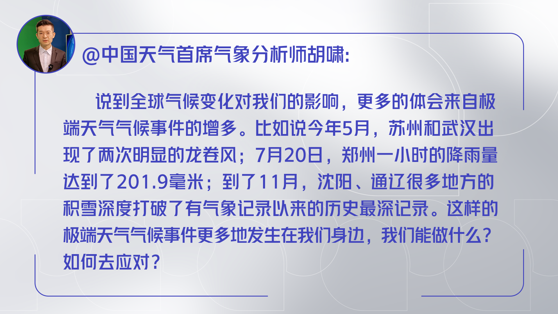 徐华清:无论是从观测事实还是模拟数据来看,气候变化已经发生了,而且变暖的趋势越来越明显,现在已经上升到气候风险、气候危机,这已经成为国际共识。
