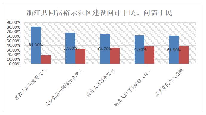 浙江共同富裕示范区建设的民意调查显示,关注度最高的指标中,居民人均可支配收入81.3%,人均消费支出64.7%,居民人均可支配收入与人均GDP之比61.9%。[5]
