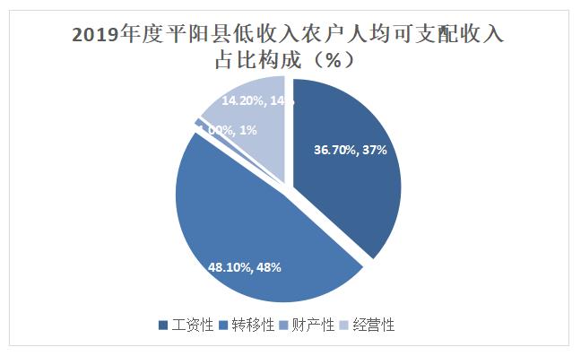 平阳县政府公开数据显示,2019年度平阳低收入农户人均可支配收入持续增长,并且超过万元达到10603元,同比增长14.5%。其中工资性收入同比增长26.6%,达到3892元,占低收入农户人均可支配收入的36.7%。转移性净收入5107元,同比增长15.3%,占低收入农户人均可支配收入的48.1%。财产性净收入101元,同比增长8%,占低收入农户人均可支配收入1.0%。经营性净收入1505元,同比下降9.7%,占低收入农户人均可支配收入14.2%。
