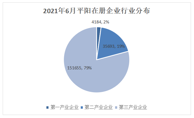 企查查专业版提供的企业工商注册实时数据显示,截至2021年6月17日,平阳在册企业(含个体户等)有199465家,第一产业企业数4184家,占比为2.18%;第二产业企业数35693家,占比18.64%,在第二产业中制造业占了93.55%;第三产业企业数151655家,占比79.18%,其中有82836家批发以及零售业企业占第三产业数的55.48%,40775家住宿和餐饮业企业占第三产业数的27.31%。第二产业和第三产业对农民增收有着决定性作用。