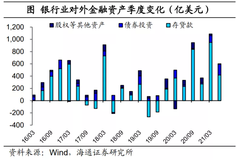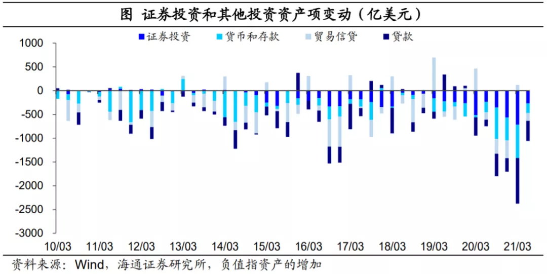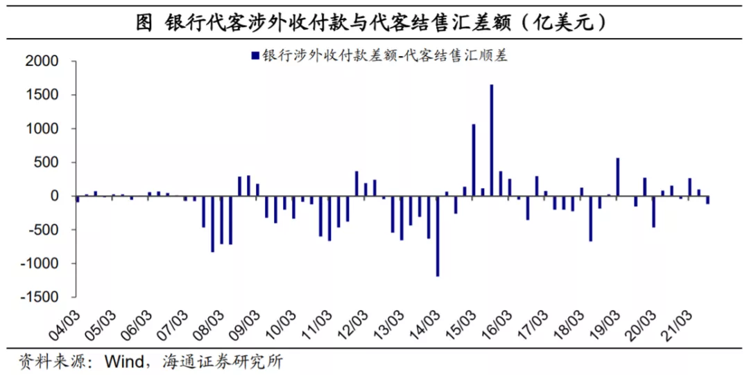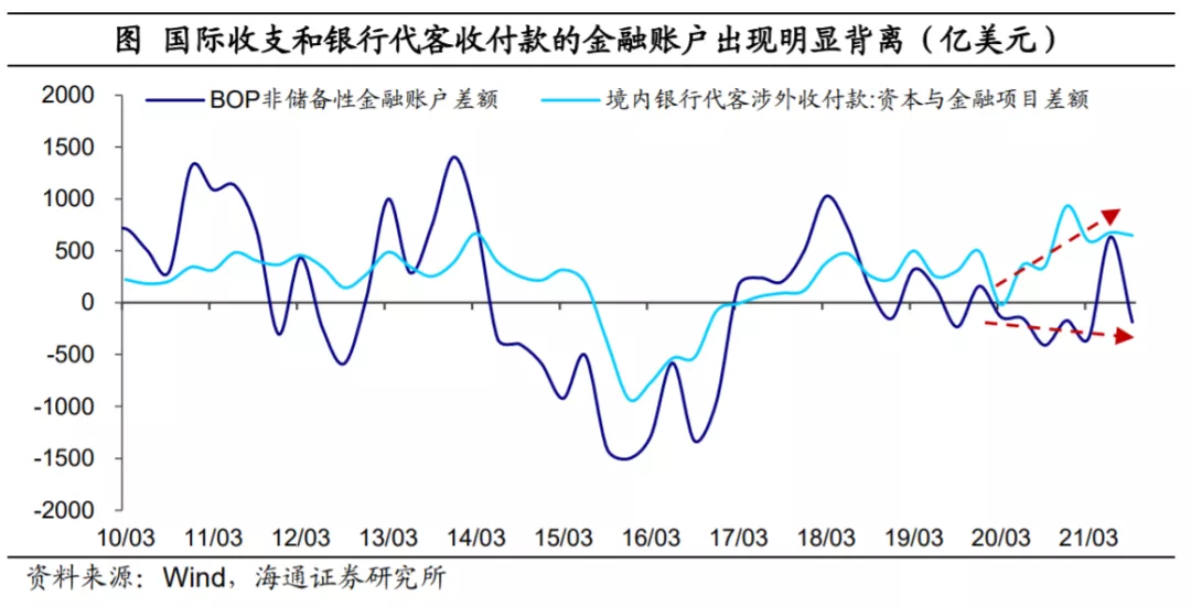 总结来看,在国际交易发生到实际资金收付环节,一方面可能有贸易顺差并未实际产生外汇流入,而直接形成实体部门的对外资产;另一方面,银行自身对外投资规模增加,并最终反映在国际收支账户的金融账户逆差中。