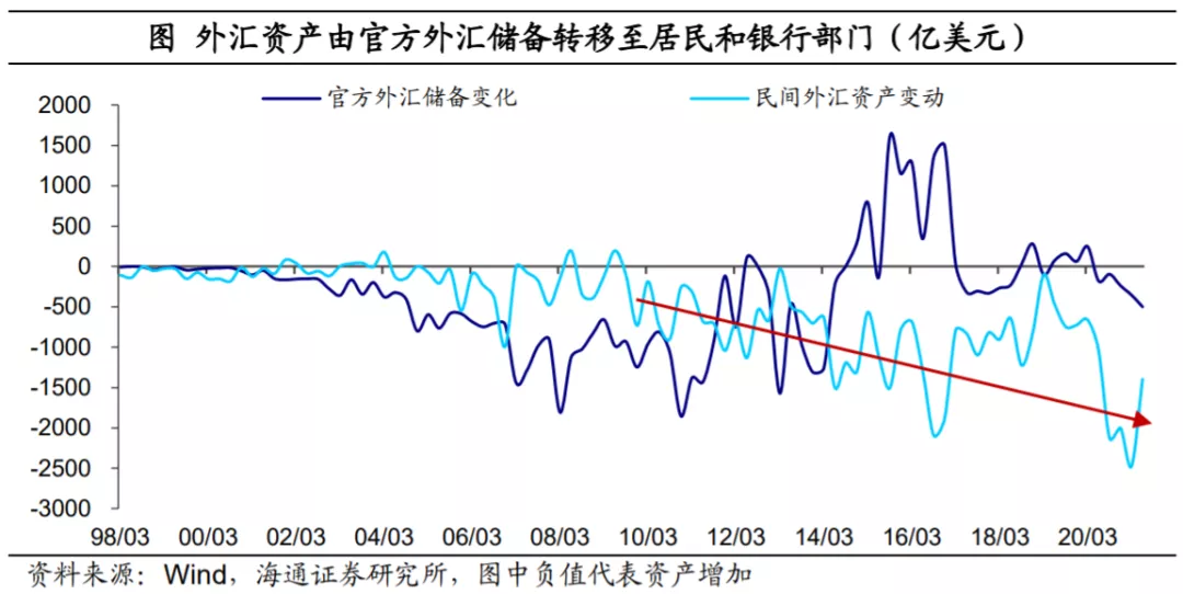 实际上,从2010年开始,民间外汇资产规模就开始加速扩大,也就是居民和金融部门更多地持有海外的金融资产,从而外汇资产呈现由官方外汇储备转移至私人部门的趋势,实现“藏汇于民”。