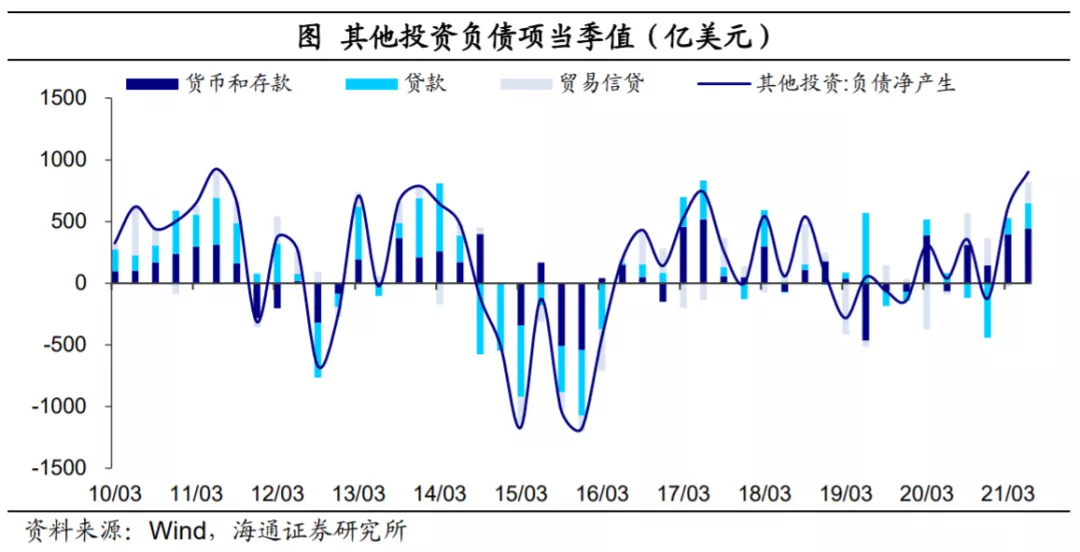 当然,这个过程中的外汇“沉淀”也会体现在国际收支平衡表(BOP)账户中。首先,贸易顺差和对应涉外收付款顺差的差额,也就是没有实际流入的部分,主要体现在“贸易信贷”和“其他应付款”项目。比如,贸易信贷净流出同样在去年二季度开始明显增长。其次,企业部门没有结汇的盈余,更多计入BOP其他投资中的货币和存款项,因而货币和存款项的变化与未结售汇部分的变化相关性较高。最后,对于商业银行,吸收的外币存款部分运用到境外,增加了对外净资产。