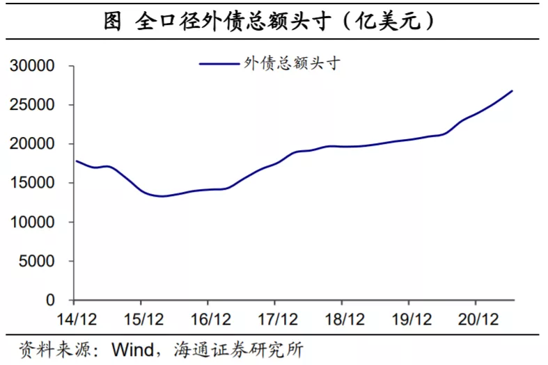 另一方面,企业和银行的外债余额也是不降反增。这部分可以通过国际收支的“其他投资”项目进行观察,2020年其他投资项累计净流入580亿美元,进入2021年继续大幅增加,单季平均增幅达到760亿美元,尤其是货币和存款负债(主要是银行对外债务)增长显著。