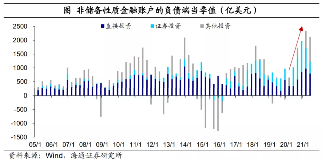 一方面,由于疫情之后我国经济在全球率先恢复,人民币资产相对表现出避险属性,吸引直接投资和证券投资流入大幅增长。2020年三季度,来华直接投资和证券投资净流入1377亿美元,创出历史新高,而后两个季度增幅进一步抬升。