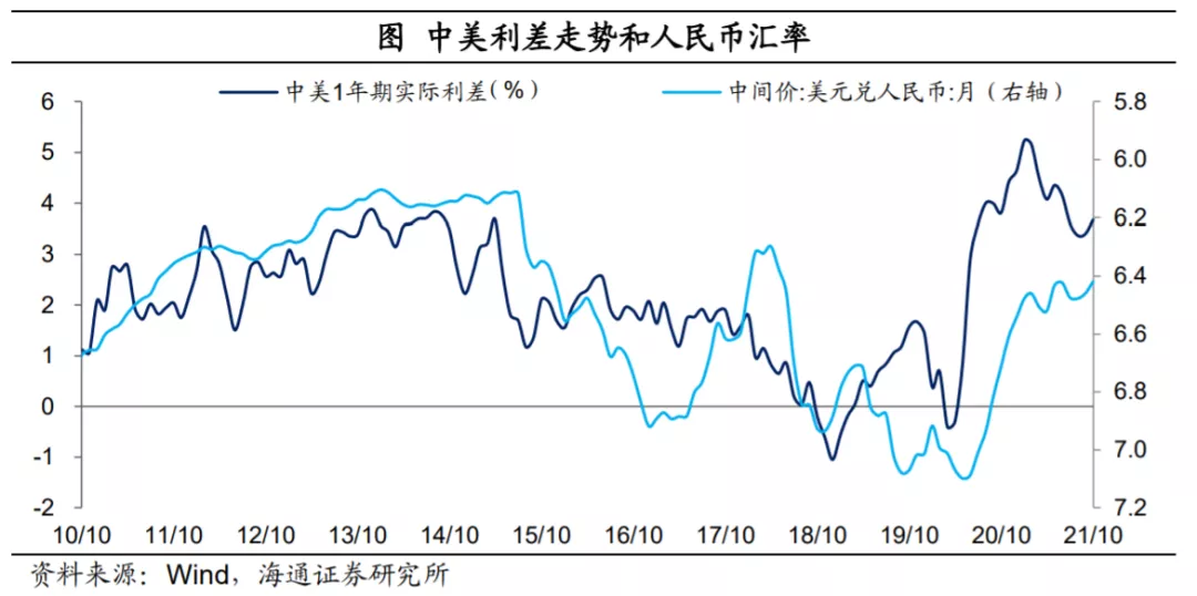 往前看,两国的复苏仍是错位的,我们认为,接下来美国政策趋紧,而我国货币易松难紧,使得中美利差或将出现一定程度的收窄。随着实际利差的收窄,人民币汇率也会更有弹性。