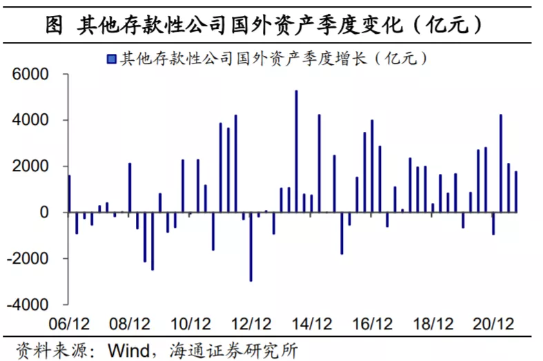 还比如,银行业对外金融资产,以及其他存款性公司的国外资产的规模增加,也可以印证没有向央行结汇的顺差规模抬升。根据外汇管理局统计,从2020年到21年2季度,银行业对外金融资产平均每个季度增长617亿美元(银行结售汇平均顺差495亿美元),明显高于2019年平均136亿美元增长。
