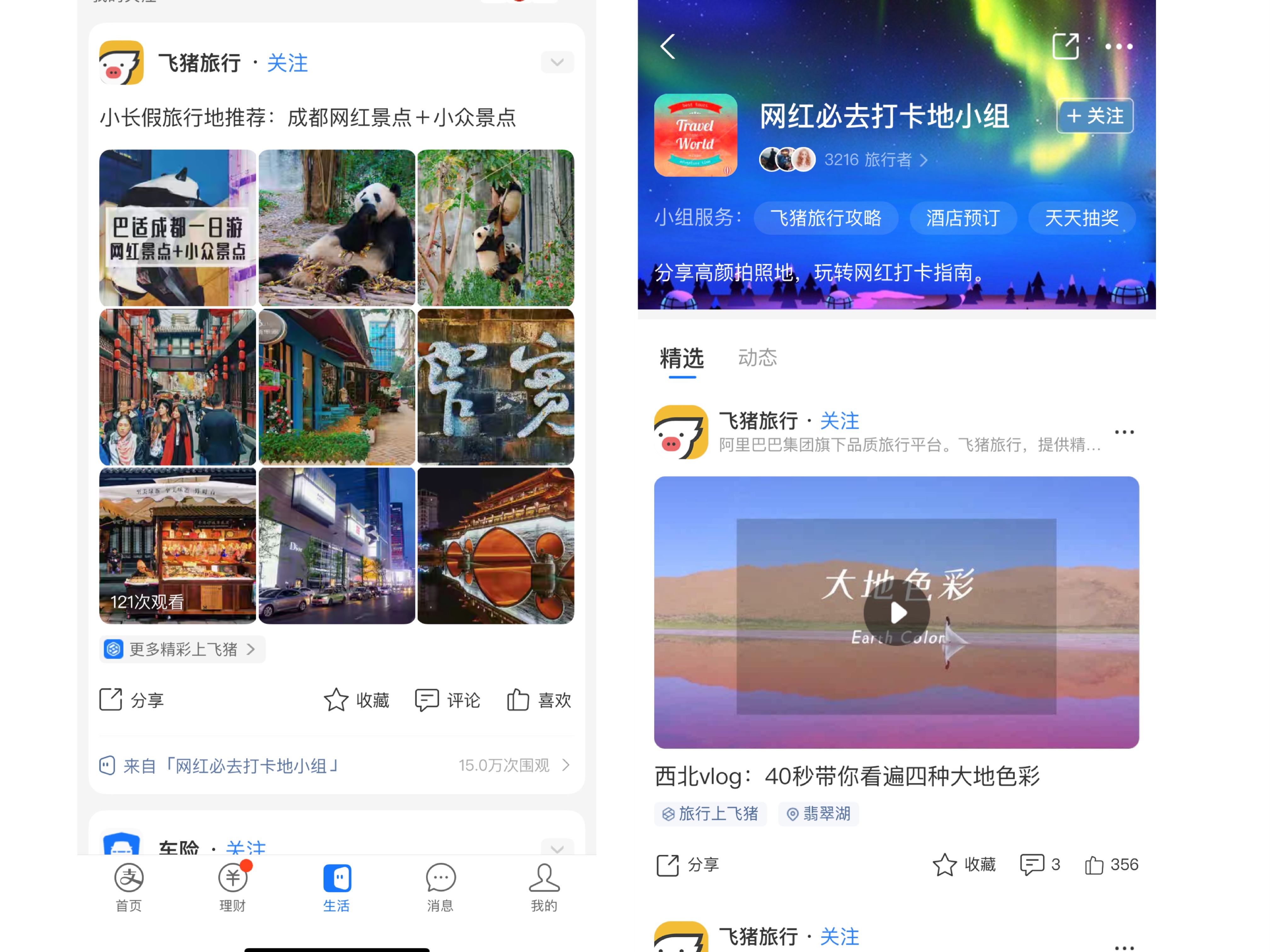 界面新闻发现,“生活”频道的页面为信息流形式,发布内容包括图片、文字和短视频,支持用户在下方进行收藏、评论和点赞。此外,内容下方支持信息聚合,链接到对应的分类小组中。