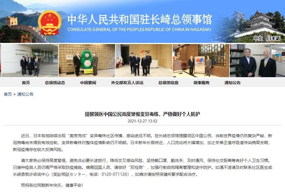 中国驻长崎总领事馆12月27日提醒领区中国公民高度警惕变异毒株,严格做好个人防护。