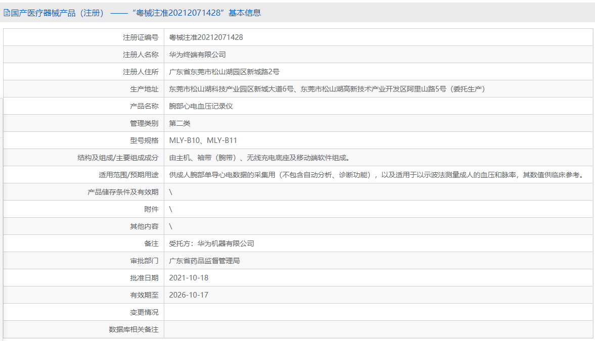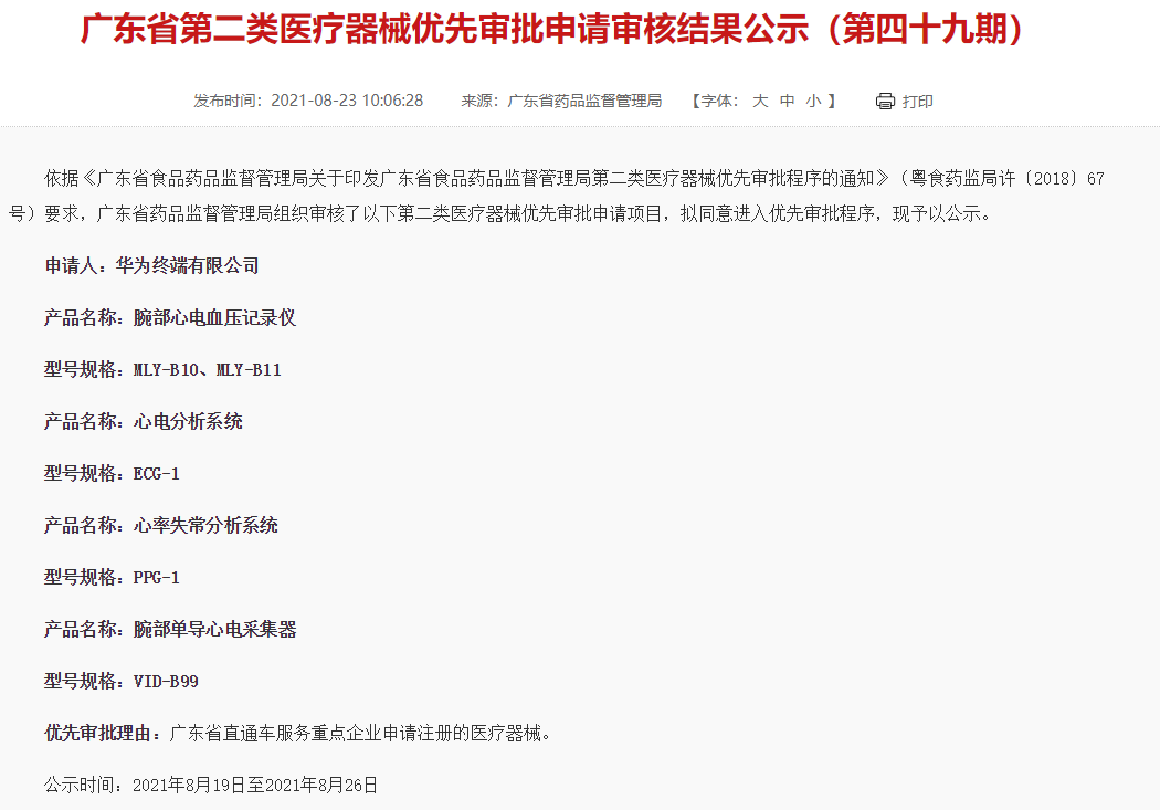 2021年8月23日,华为终端有限公司的腕部心电血压记录仪(MLY-B10、MLY-B11)、心电分析系统(ECG-1)、心率失常分析系统(PPG-1)、腕部单导心电采集器(VID-B99)四款医疗器械进入第二类医疗器械优先审批程序。目前腕部心电血压记录仪和腕部单导心电采集器已获批生产。