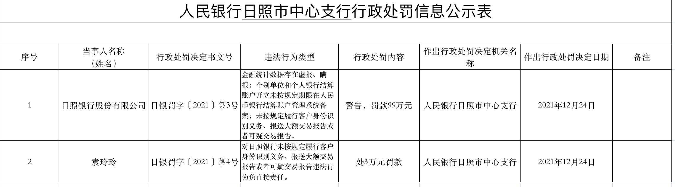 12月27日,人民银行日照市中心支行发布的行政处罚信息公示表显示,12月24日,日照银行股份有限公司被人民银行日照市中心支行警告,并处罚款99万元。违法行为类型为金融统计数据存在虚报、瞒报;个别单位和个人银行结算账户开立未按规定期限在人民币银行结算账户管理系统备案;未按规定履行客户身份识别义务、报送大额交易报告或者可疑交易报告。