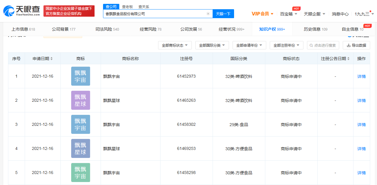 天眼查App显示,12月16日,香飘飘食品股份有限公司申请注册多个“飘飘宇宙”“飘飘星球”商标,国际分类为啤酒饮料、方便食品等,当前商标状态均为申请中。