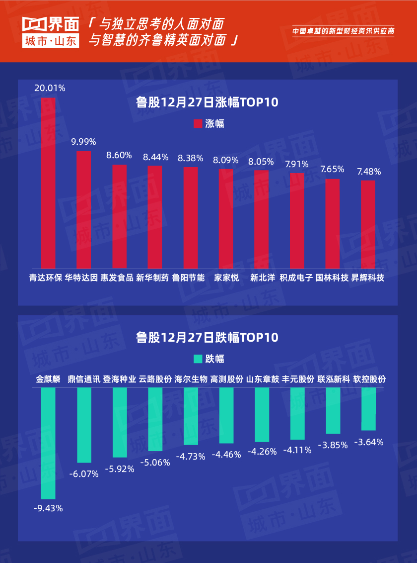 受大盘影响,12月27日,山东省内沪深股票有163只个股上涨,90只下跌,青达环保领涨。