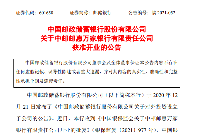 12月27日,邮储银行(601658.SH)发布公告称,银保监会已批准邮储银行直销银行子公司中邮邮惠万家银行有限责任公司(下称“邮惠万家银行”)开业。