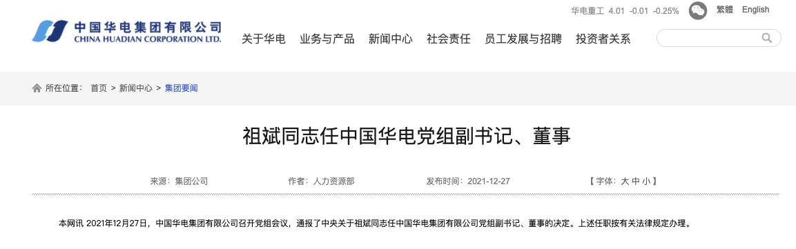中国华电官网消息,2021年12月27日,中国华电集团有限公司召开党组会议,通报了中央关于祖斌同志任中国华电集团有限公司党组副书记、董事的决定。上述任职按有关法律规定办理。