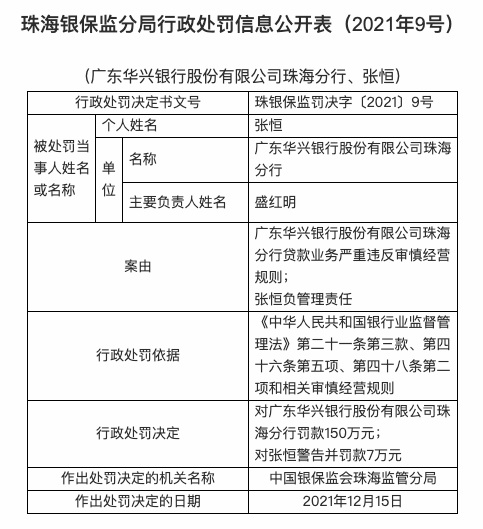 12月27日,珠海银保监分局发布的行政处罚信息公开表显示,广东华兴银行股份有限公司珠海分行因贷款业务严重违反审慎经营规则,珠海银保监分局对其罚款150万元;对负管理责任的张恒警告并罚款7万元。