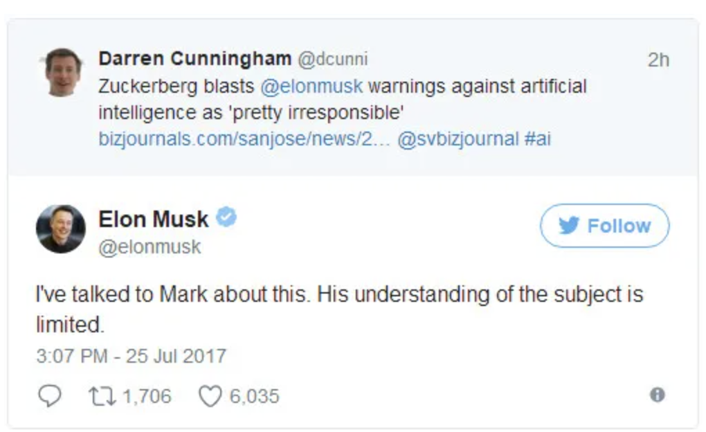 马斯克显然不高兴,发推称:“我和扎克聊过人工智能,他对这个领域的了解很有限。”意思就是,说得好下次别说了,你懂什么啊你?