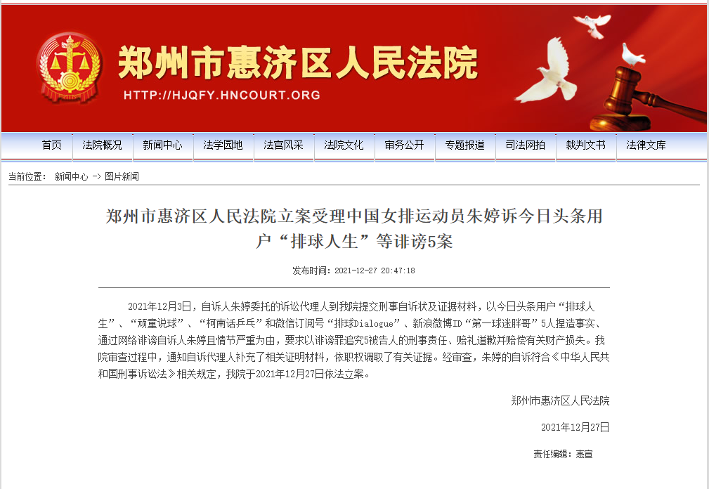河南省郑州市惠济区法院官网27日消息,12月3日,自诉人朱婷委托的诉讼代理人到该院提交刑事自诉状及证据材料,以今日头条用户“排球人生”、“顽童说球”、“柯南话乒乓”和微信订阅号“排球Dialogue”、新浪微博ID“第一球迷胖哥”5人捏造事实、通过网络诽谤自诉人朱婷且情节严重为由,要求以诽谤罪追究5被告人的刑事责任、赔礼道歉并赔偿有关财产损失。