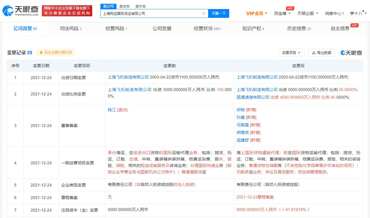 天眼查APP显示,12月24日,上海翔运国际货运有限公司发生多项工商变更,法定代表人由钱江变更为庞建哲;股东新增圆通速递有限公司,持股比例45%;公司注册资本增至约9090.91万元人民币,增幅超81%。
