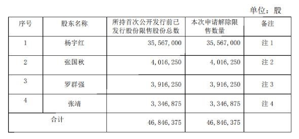 在这两位董事、高管披露减持计划后的几天,11月15日,宇晶股份发布了《首次公开发行前已发行股份上市流通提示性公告》,将解禁46,846,375股,涉及4名股东,占公司股份总数的46.8464%。