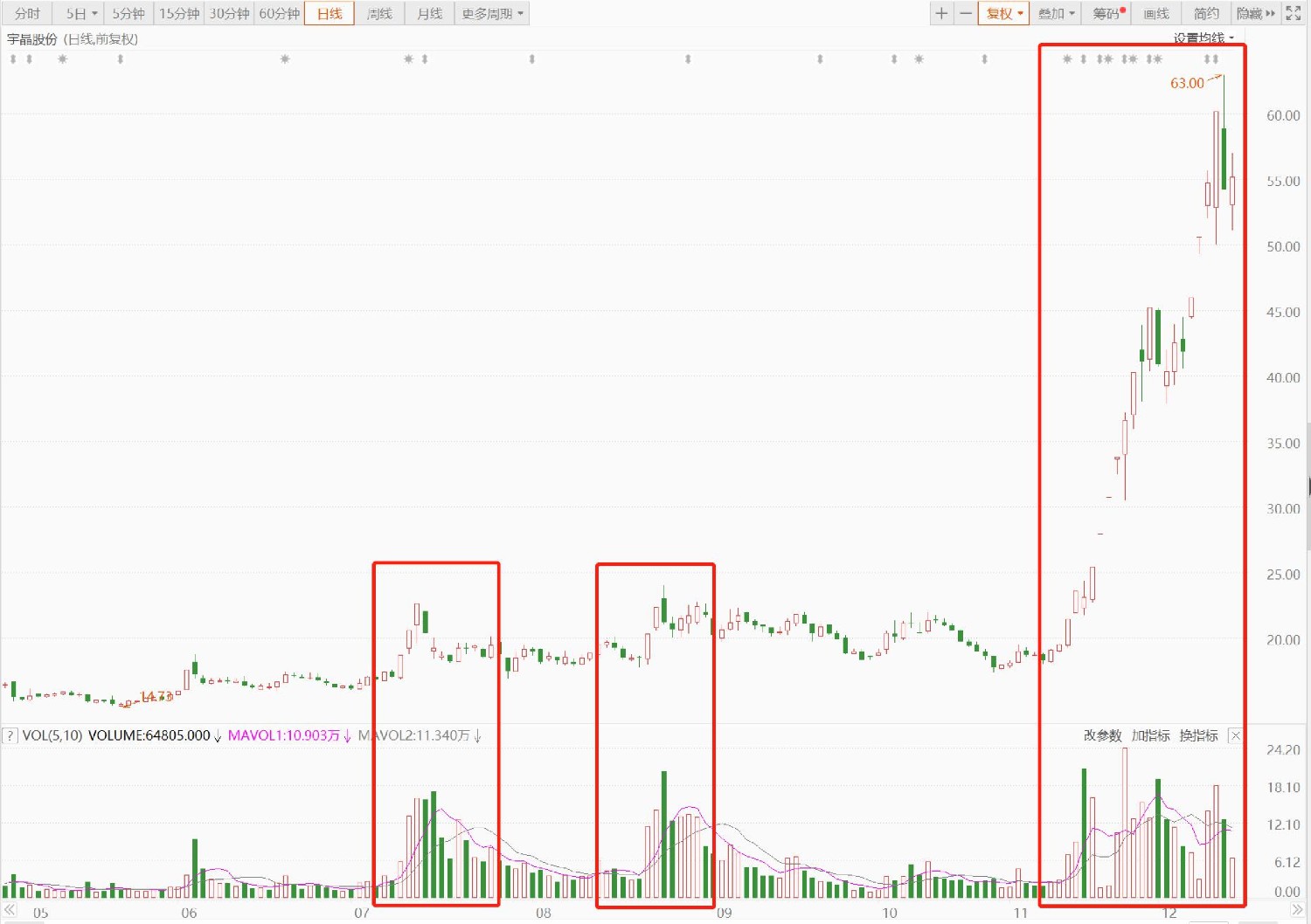 2021年下半年,宇晶股份的股价出现了一些异常情况。比如说,2021年的7、8月间,如下图所示,出现了两次放量上涨又迅速回调的波动;此后,经过较长一段时间的动荡调整之后,在11月份终于出现了一轮快速且大幅拉涨的行情,股价从不足20元一路飙涨到当前最高点63元,期间涨幅超过200%。