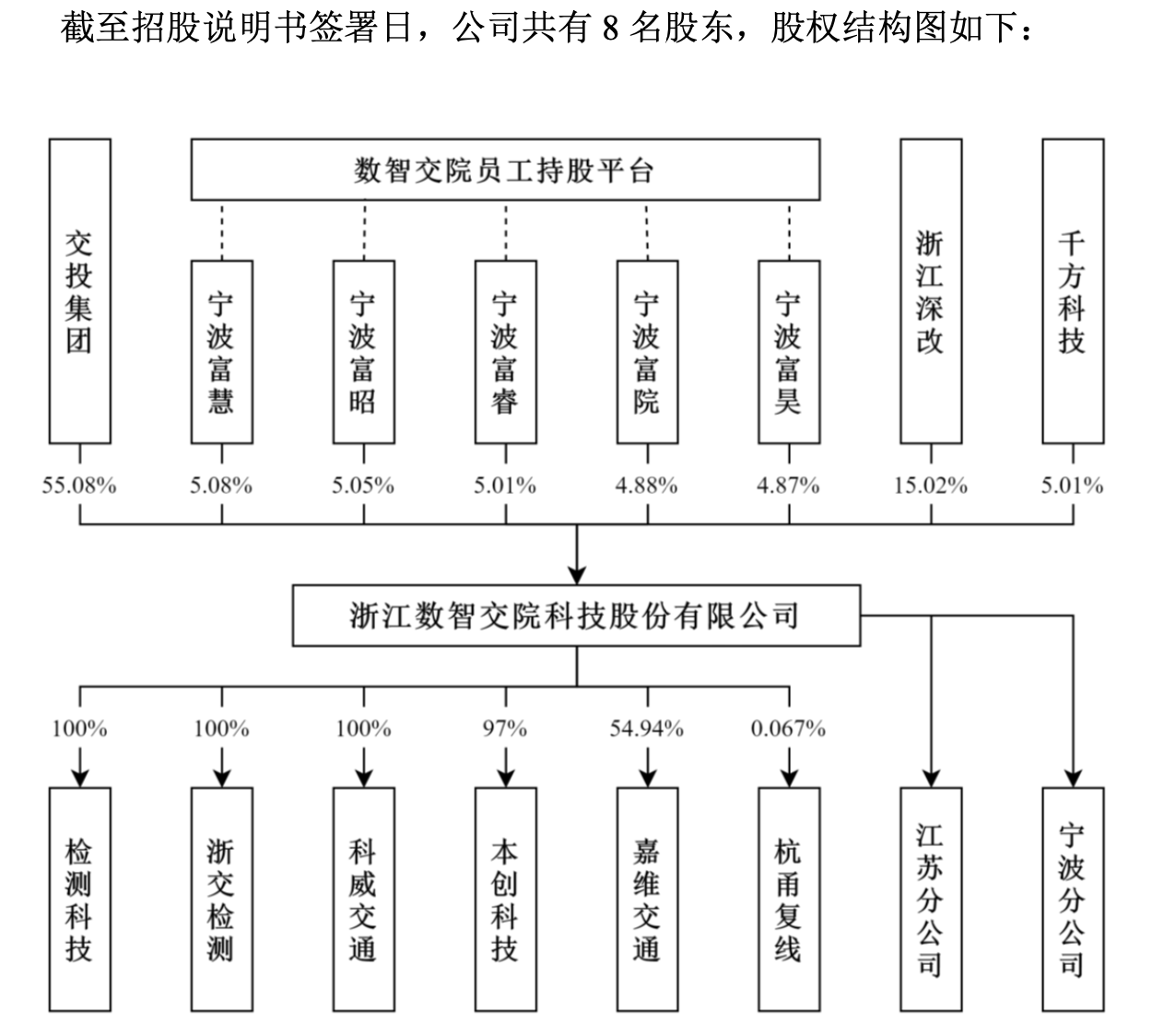 2020年12月24日,交规院有限整体变更为股份有限公司,企业名称变更为浙江数智交院科技股份有限公司,注册资本为2.4亿元。截至招股书签署日,交投集团直接持有公司 55.08%的股份,为公司的控股股东及实际控制人。