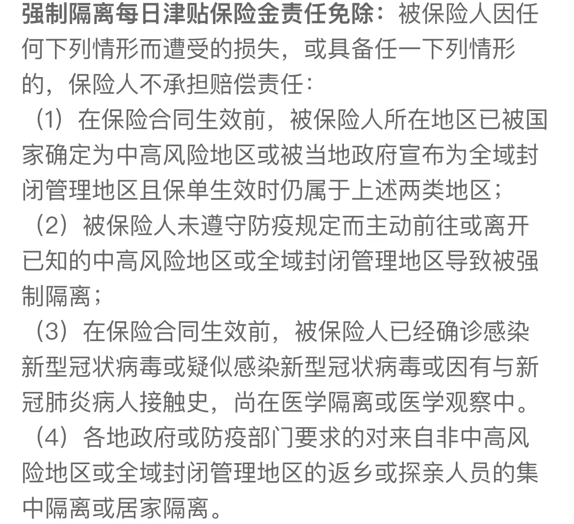 在黑猫投诉平台上,有消费者反映称,自己8月购买了众安保险推出的“新冠隔离疫情津贴险”,这份保险在页面上标明,对因交通工具与新冠患者接触而被集中隔离的有1000元/天的高额补贴,然而在隔离之后理赔时才发现,条款中将免费隔离列为免赔责任。实际上,多地政策中,密接集中隔离都为免费隔离,自费隔离常见于境外归国情况。
