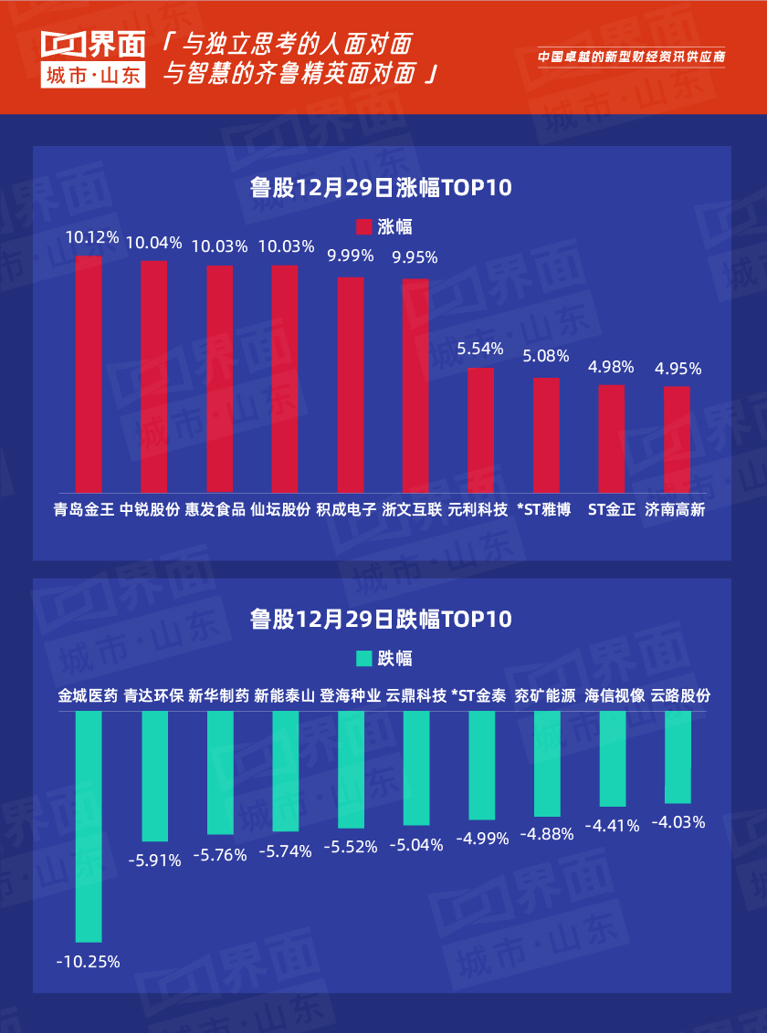 受大盘影响,12月29日,山东省内沪深股票有122只个股上涨,126只下跌,青岛金王领涨。