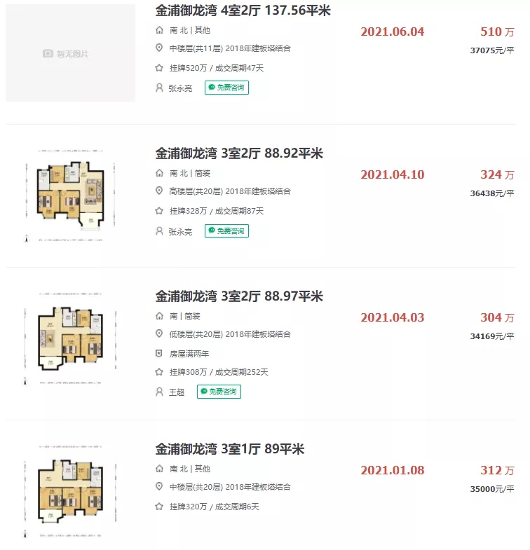 而根据链家网数据显示,目前金浦御龙湾小区的挂牌均价为38314元/㎡,目前有34套房源在售,价格集中在3.5万/㎡-3.7万/㎡。
