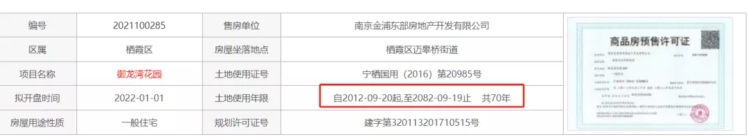 还有一点值得注意,据南京网上房地产显示,金浦御龙湾是2012年拿得地,项目产权“缩水”近9年。
