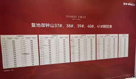 复地御钟山今天早上8点在新地酒店开盘,收官楼栋37-41号楼,共126套(人才38套、无房38套)毛坯住宅,户型建面约213、252㎡,销许均价36494元/㎡,首付8成。
