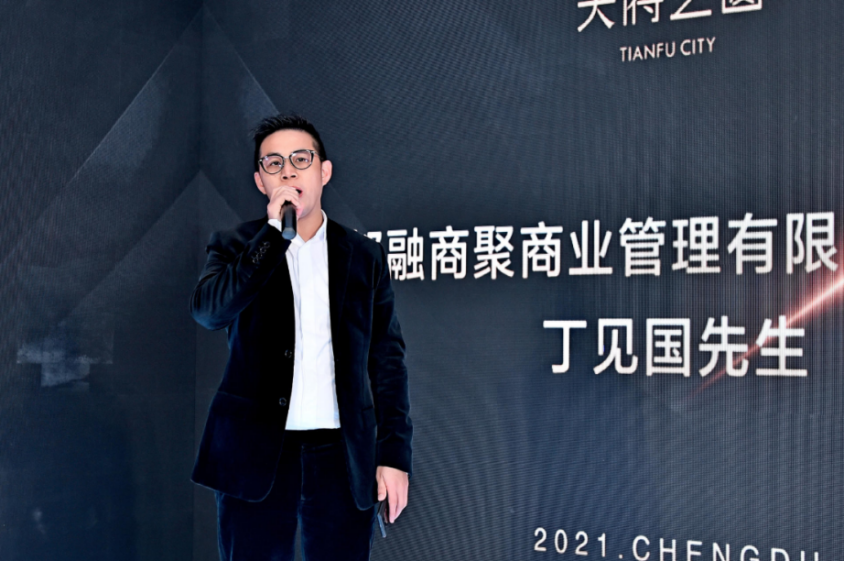 在主持人隆重介绍后,成都融商聚商业管理有限公司董事长丁见国登台致辞,并代表公司全体股东及同仁,对参加天府之窗产业发布会的所有来宾表示衷心的欢迎和诚挚的感谢。