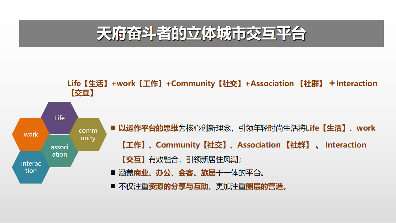 对于【天府之窗】的产业定位,王方君分享到,项目定位依托城市发展规划战略,探索产城融合模式,基于项目区位及产业资源,发挥全球首发优势,以运作平台的思维为核心创新理念,引领年轻时尚生活,将Life【生活】、Work【工作】、Community【社交】、Association【社群】、Interaction【交互】有效融合,打造涵盖商业、办公、会客、旅居于一体的平台,献给新成都的缔造者。