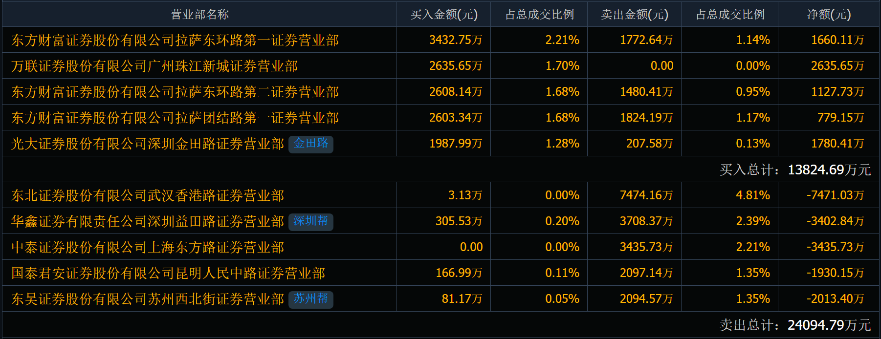 买三、买四分别为东方财富证券股份有限公司拉萨东环路第二证券营业部、东方财富证券股份有限公司拉萨团结路第一证券营业部,二者分别净买入1127.73万元和779.15万元。
