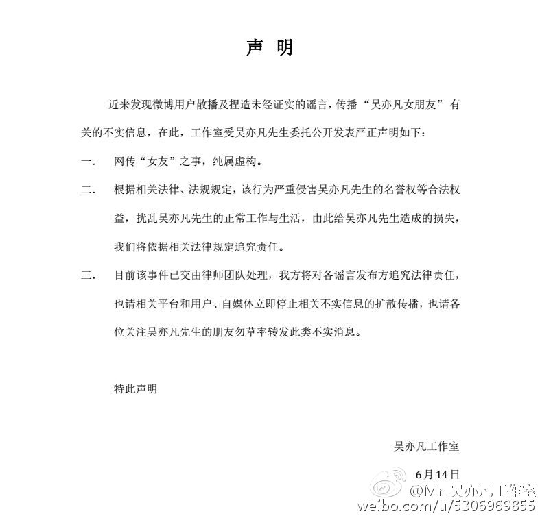 声明中表示网传“女友”之事纯属虚构,该行为严重侵害吴亦凡的名誉权等合法权益,扰乱吴亦凡的正常工作与生活,将依据相关法律规定追究责任。