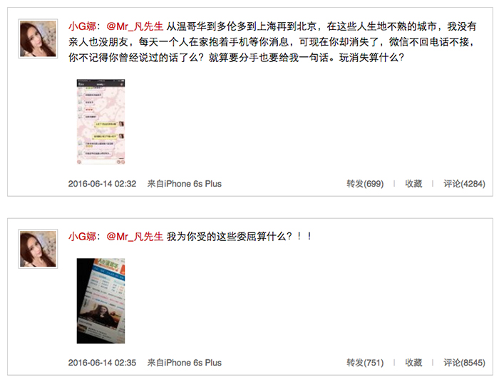 该网友在微博上写道:@Mr_凡先生 从温哥华到多伦多到上海再到北京,在这些人生地不熟的城市,我没有亲人也没朋友,每天一个人在家抱着手机等你消息,可现在你却消失了,微信不回电话不接,你不记得你曾经说过的话了么?就算要分手也要给我一句话。玩消失算什么?