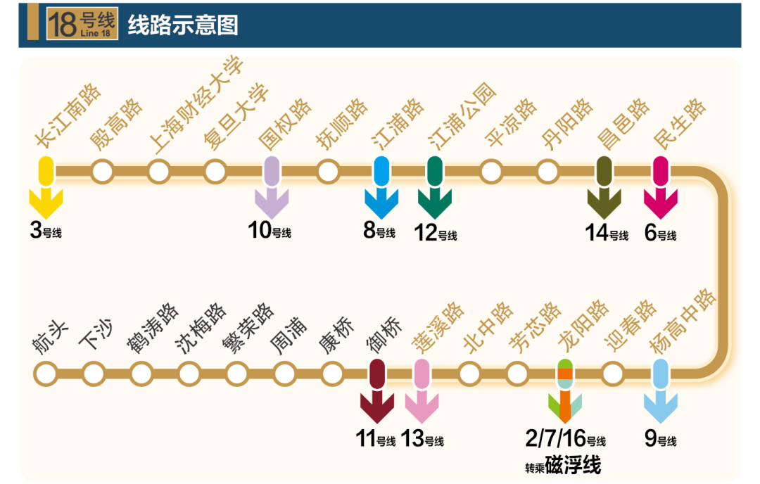 18号线经过龙阳路站,这也使得龙阳路站成为连接5条轨道线路的超级换乘站,在此可换乘2、3、16、18号线以及磁浮线。